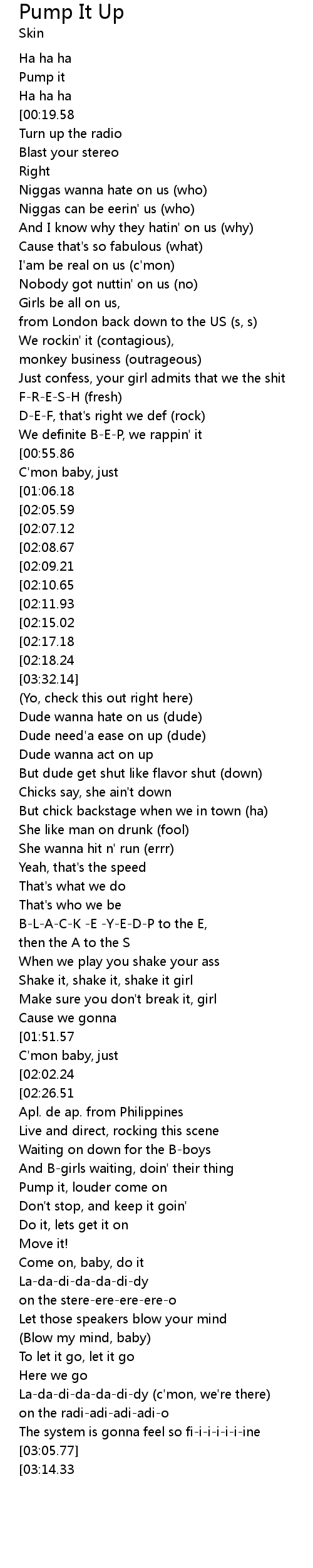 | [01:07.82][01:06.18][01:04.57][01:03.10][01:01.68][01:00.09] | Pump it (louder) |