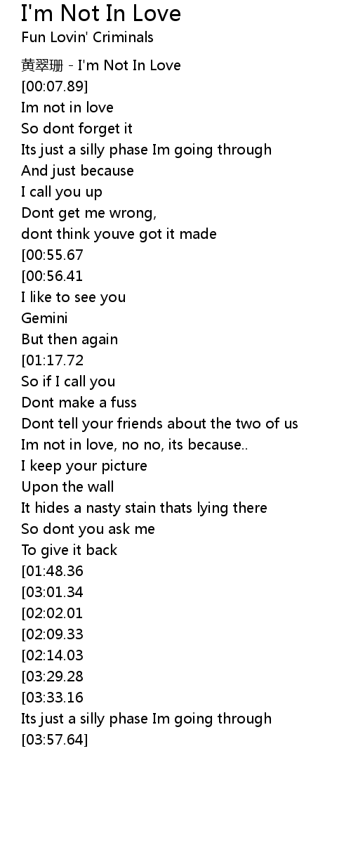 | [00:01.12] | 黄翠珊 - I'm Not In Love |