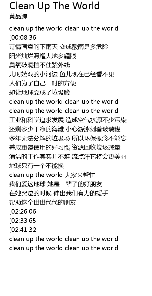| [00:16.18][00:08.36] | clean up the world clean up the world |