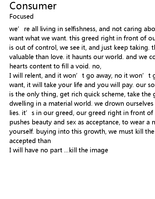 | I will relent, and it won' t go away, no it won' t go away. this image you want, it will take your life and you will pay. our society teaches consumption is the only thing, get rich quick scheme, take the goods while they' re cheap. dwelling in a material world. we drown ourselves in growth and purchase these lies. it' s in our greed, our greed right in front of our eyes. the media pushes beauty and sex as acceptance, to wear a mask or a condom and fool yourself. buying into this growth, we must kill the image, if this is how to be accepted than | |