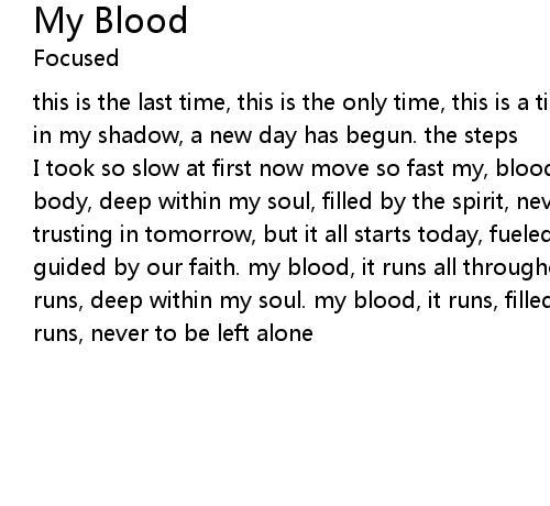 | I took so slow at first now move so fast my, blood it runs, all throughout my body, deep within my soul, filled by the spirit, never to be left alone. trusting in tomorrow, but it all starts today, fueled by an inner strength, guided by our faith. my blood, it runs all throughout my body. my blood, it runs, deep within my soul. my blood, it runs, filled by the spirit. my blood, it runs, never to be left alone |