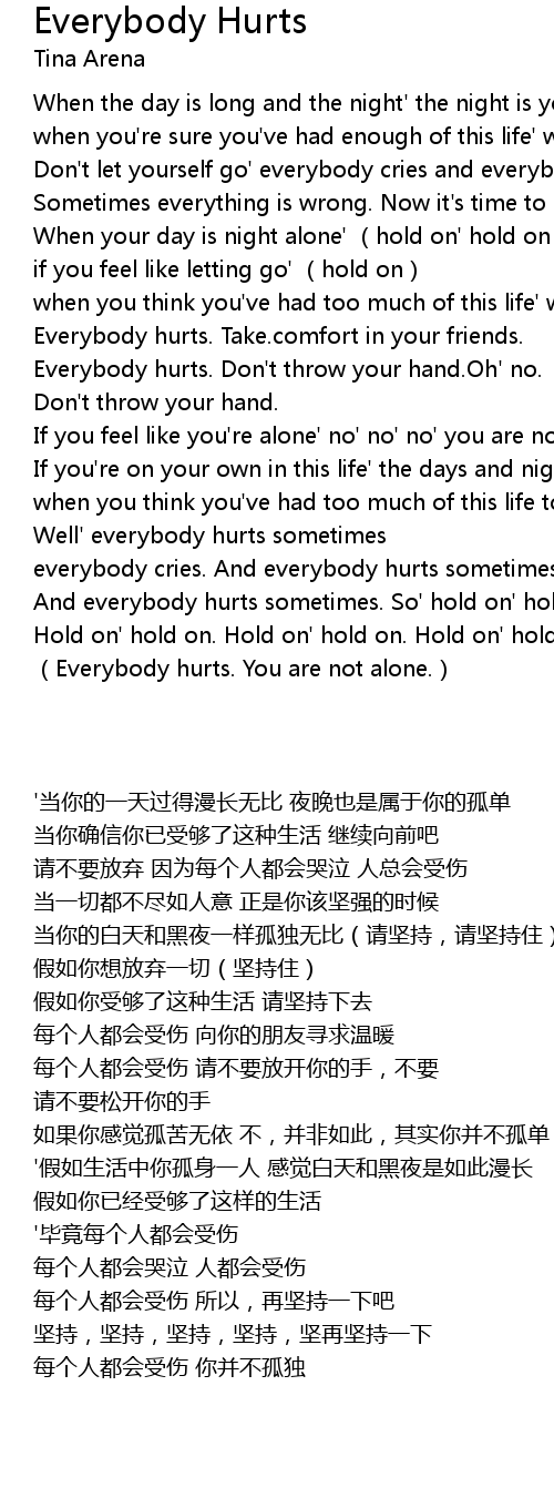 | [03:57.28] | And everybody hurts sometimes. So' hold on' hold on. |