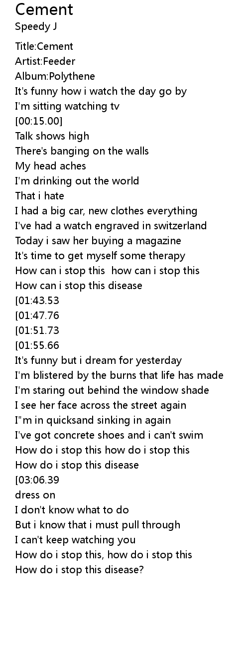 | [02:47.46][01:47.76][00:52.08] | Sits by her radio (i'm in cement) |