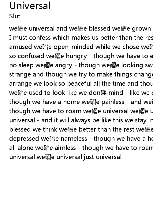 | I must confess which makes us better than the rest we la e always happy and amused we la e openminded while we chose we la e intellectual confused we la e so confused we la e hungry though we have to eat we la e thirsty we can find no sleep we la e angry though we la e looking sweet we stay untouchable and strange and though we try to make things change we la e far too boneless to arrange we look so peaceful all the time and though we la e dangerously unkind we la e used to look like we don qing mind like we don qing mind we la e nameless though we have a home we la e painless and we la e all alone we la e aimless though we have to roam we la e universal we la e universal we la e universal so universal and it will always be like this we stay indifferent and we la e blessed we think we la e better than the rest we la e always thoughtful and depressed we la e nameless though we have a home we la e painless and we la e all alone we la e aimless though we have to roam we la e universal we la e universal we la e universal just universal |