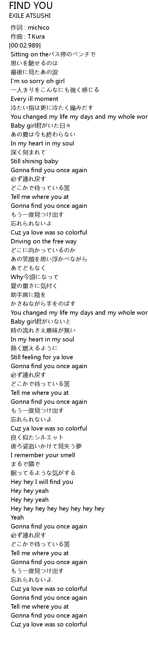 | [04:37.957] | Hey hey I will find you |