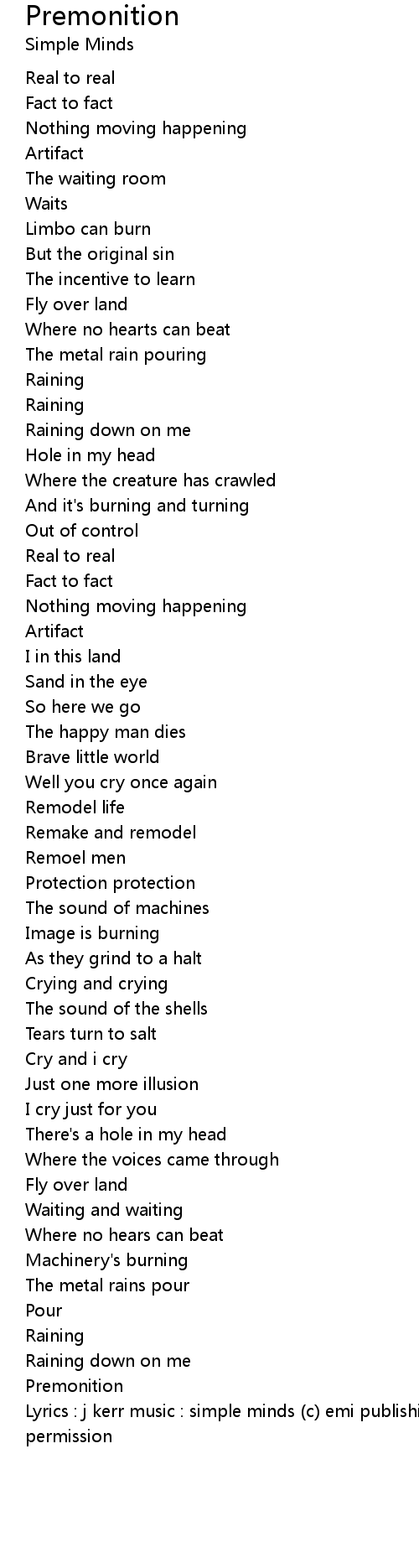 Lyrics : j kerr music : simple minds (c) emi publishing ltd reproduced without permission |