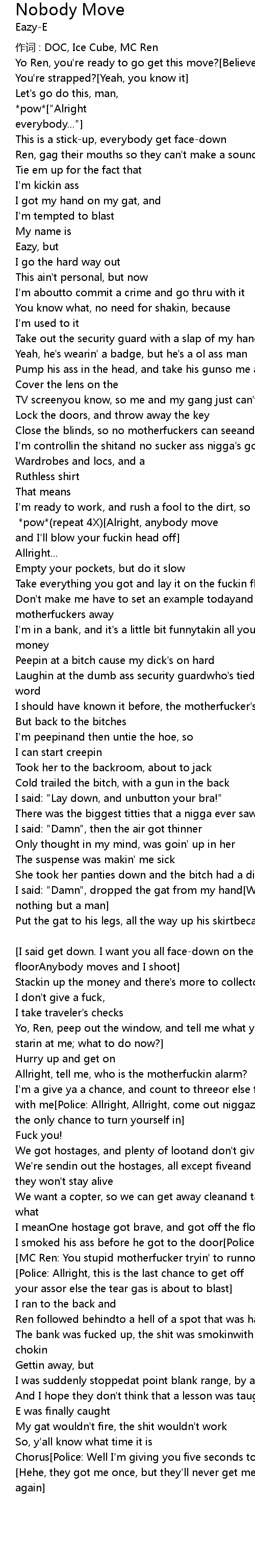 | Chorus:["Nobody moves, nobody gets hurt"] *pow*(repeat 4X)[Alright, anybody move and I'll blow your fuckin head off] | |