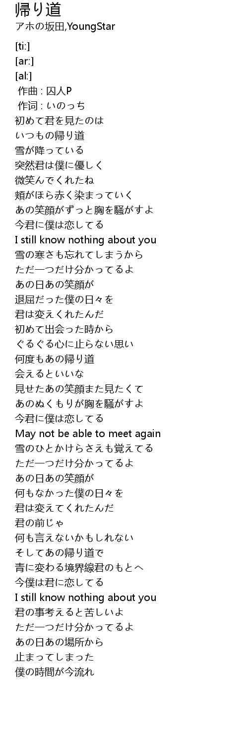 | [00:59.16] | 雪の寒さも忘れてしまうから |