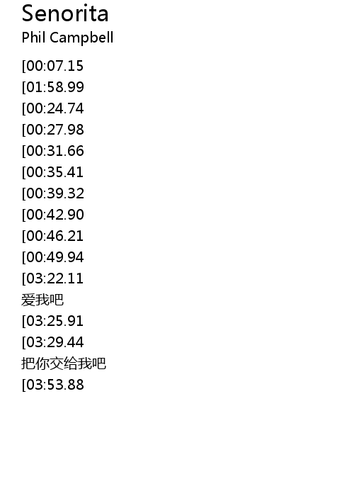 | [03:38.94][03:22.11][03:07.59][02:23.96][02:08.98][01:38.02][00:53.00] | Senorita 爱我吧 |