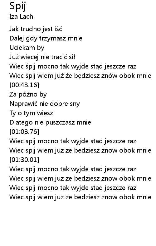 | [01:14.86] | Wiec spij wiem juz ze bedziesz znow obok mnie |