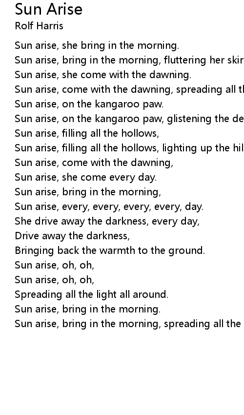 Sun arise, every, every, every, every, day. |