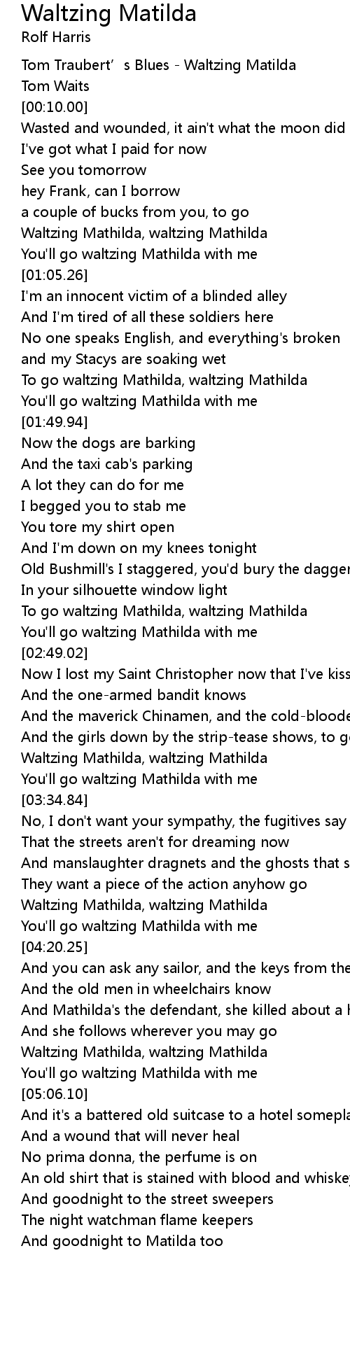 | [00:00.00] | Tom Traubert' s Blues Waltzing Matilda |