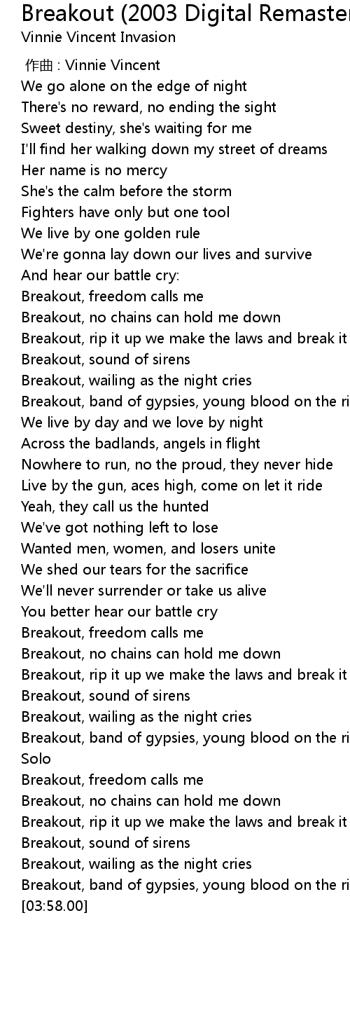 | [01:44.66] | Breakout, rip it up we make the laws and break it |