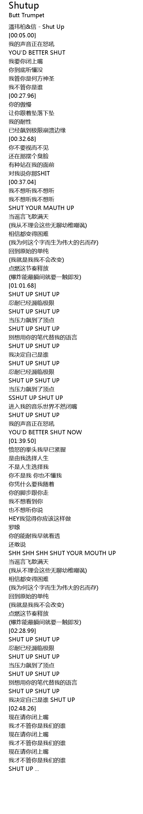 | [00:39.23] | SHUT YOUR MAUTH UP |