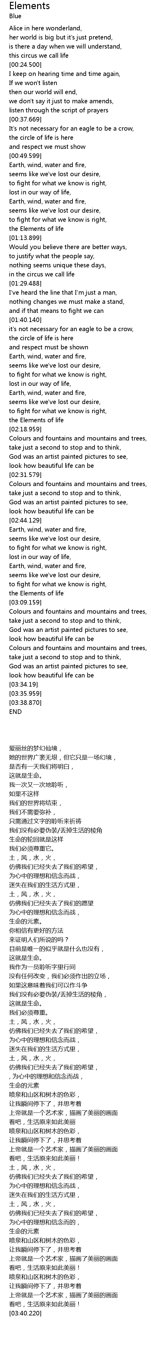 | [02:19.819] | Colours and fountains and mountains and trees, |