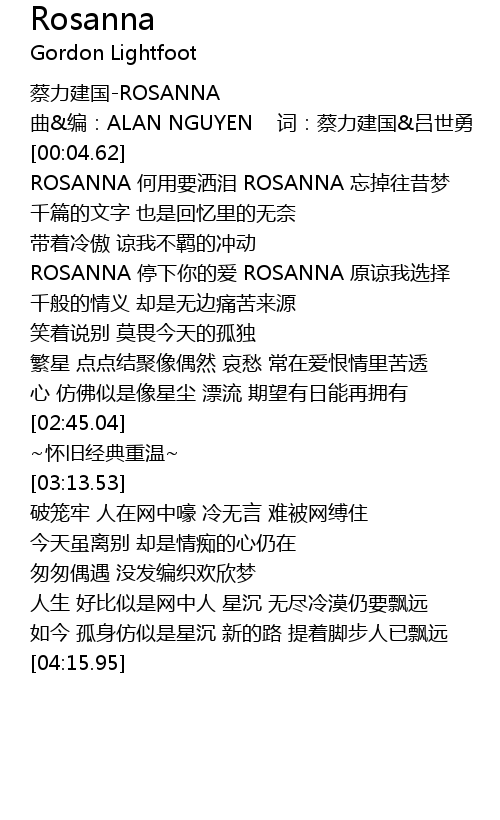| [01:14.13] | ROSANNA 何用要洒泪 ROSANNA 忘掉往昔梦 |