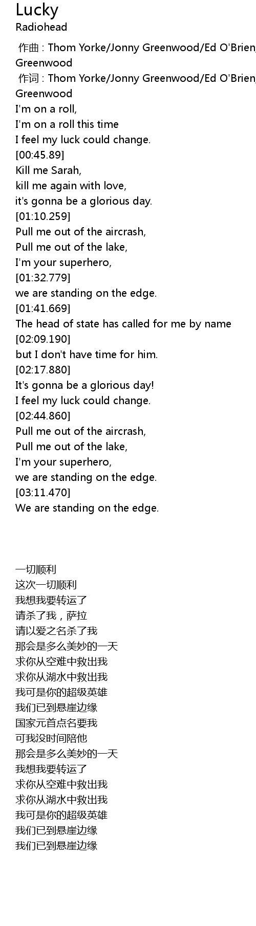 | [00:01.00] | 作词 : Thom Yorke/Jonny Greenwood/Ed O'Brien/Phil Selway/Colin Greenwood |
