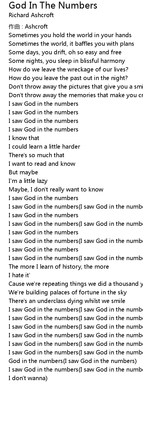 | I saw God in the numbers I saw God in the numbers I don' t wanna, I don' t wanna, I don' t wanna |
