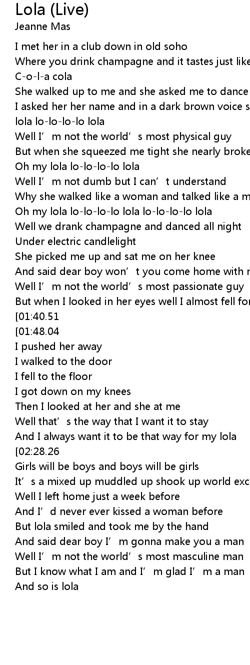 | [00:23.64] | I asked her her name and in a dark brown voice she said lola L-o-l-a lola lo-lo-lo-lo lola |