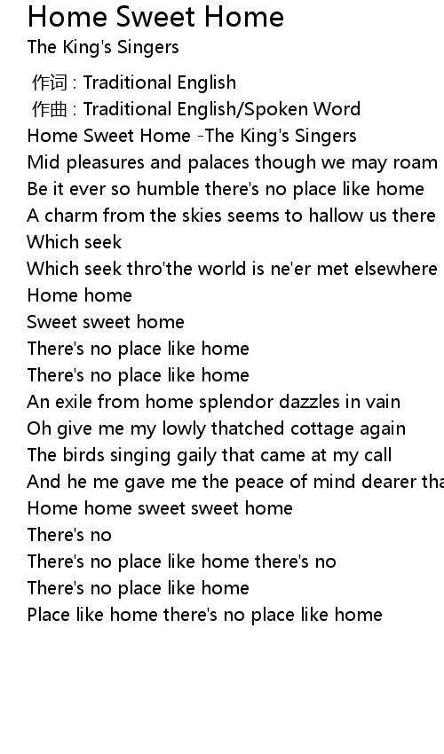 | [00:11.546] | Be it ever so humble there' s no place like home |