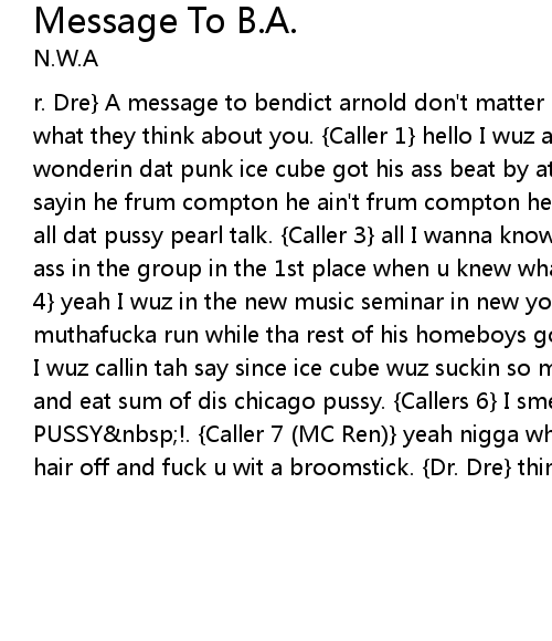 r. Dre} A message to bendict arnold don't matter how hard you try to be here's what they think about you. {Caller 1} hello I wuz at celebreality and I wuz wonderin dat punk ice cube got his ass beat by atl. {Caller 2} yo dat nigga wuz sayin he frum compton he ain't frum compton he frum a planet called punk with all dat pussy pearl talk. {Caller 3} all I wanna know iz why yall let his punk ass in the group in the 1st place when u knew what kinda bitch he wuz. {Caller 4} yeah I wuz in the new music seminar in new york and I watch that punk muthafucka run while tha rest of his homeboys got dey ass beat {Caller 5} hello I wuz callin tah say since ice cube wuz suckin so much new york dick can he come and eat sum of dis chicago pussy. {Callers 6} I smell *sniff *sniff PUSSY !. {Caller 7 (MC Ren)} yeah nigga when we see yo azz we go cut your hair off and fuck u wit a broomstick. {Dr. Dre} think about punk muthafucka |