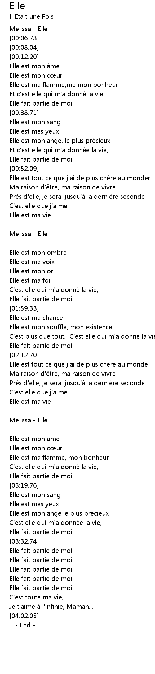 | [02:13.00] | Elle est tout ce que j' ai de plus che re au monde |