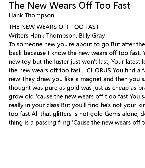 To someone new you're about to go But after the Charm has passed You'll come back because I know the new wears off too fast. You're like a Kid with a brand new toy but the luster just won't last, Your latest love is a passing joy 'Cause the new wears off too fast... CHORUS You find a fascination In loving someone new They draw you like a magnet and then you say"we're thru!" The love you thought was pure as gold was just as cheap as brass I knew his love would soon grow old 'cause the new wears off t oo fast You say you found another one who's really in your class But you'll find he's not your kind 'Cause the new wears off too fast All that glitters is not gold Gems alone, don't flash, Your one-time thing is a passing fling 'Cause the new wears off too fast CHORUS |