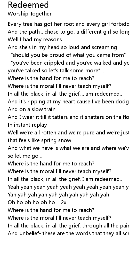 | [02:43.96] | In all the black, in all the grief, I am redeemed |