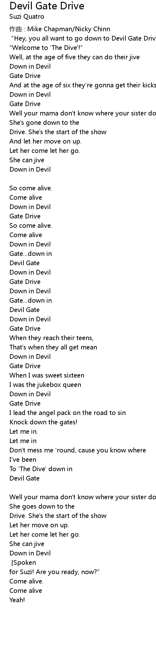 | Gate Drive [Repeat Chorus] [Spoken] "Come on, boys. Let's do it one more time for Suzi! Are you ready, now?" | |