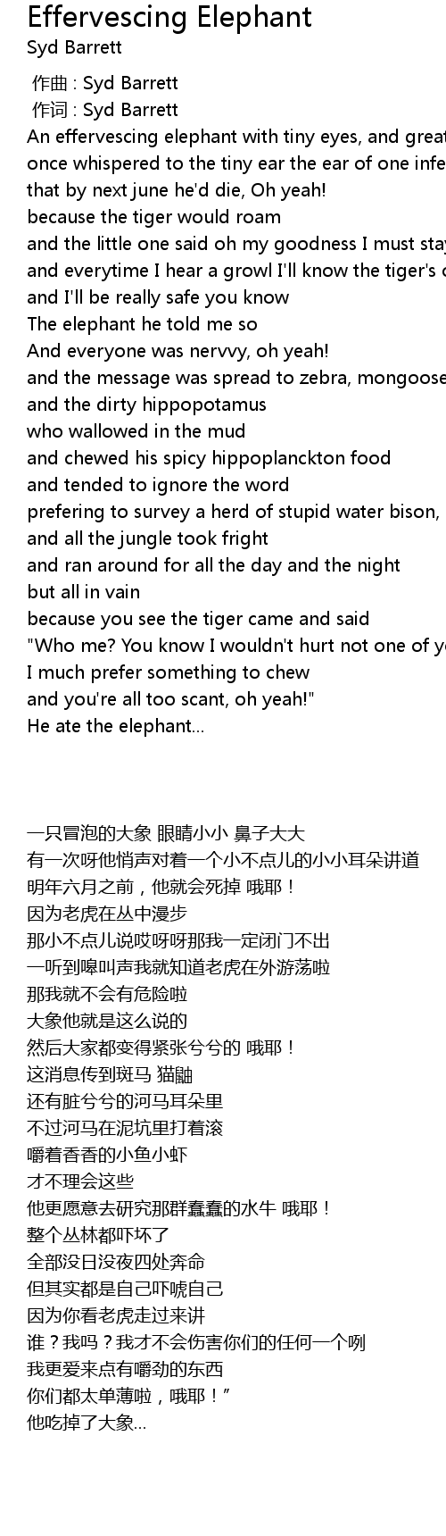 | [00:28.01] | An effervescing elephant with tiny eyes, and great big trunk |