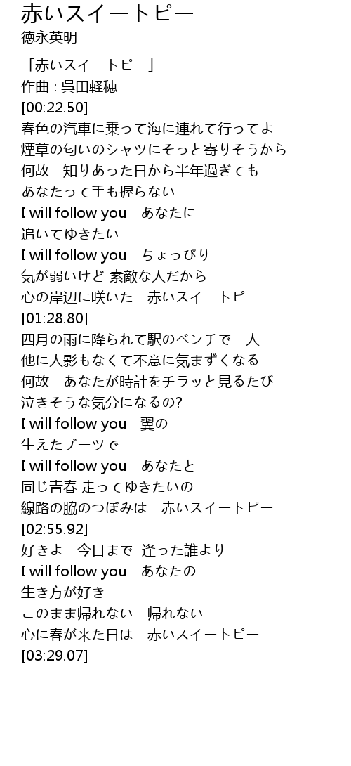 | [03:18.63] | 心に春が来た日は 赤いスイートピー |