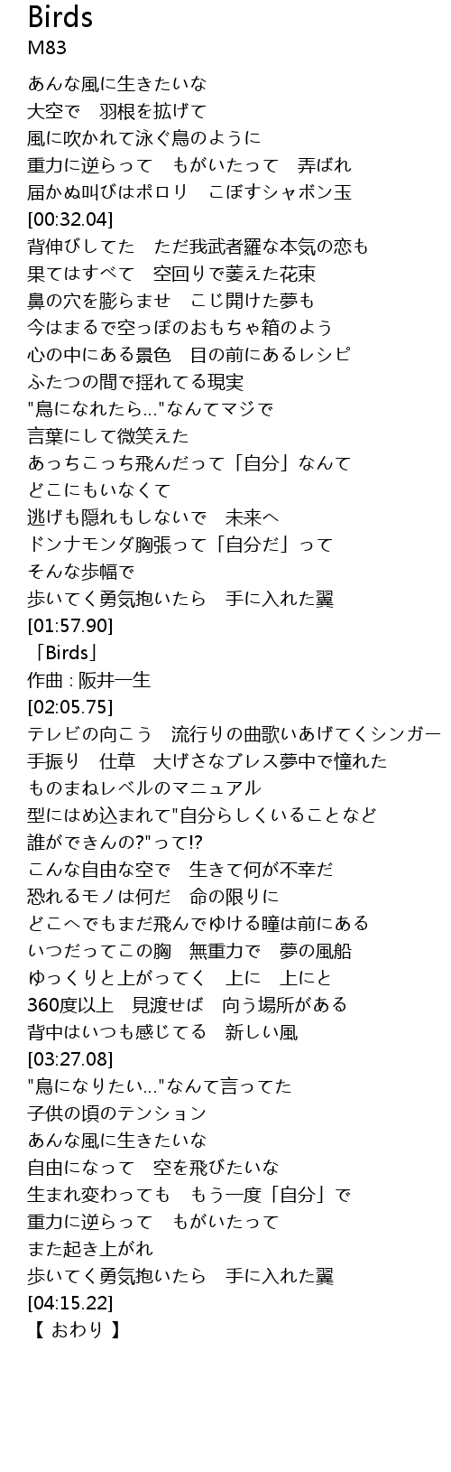 | [00:08.37] | 風に吹かれて泳ぐ鳥のように |