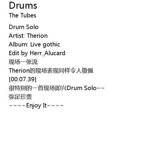| [00:08.39] | 很特别的一首现场即兴Drum Solo~~ |