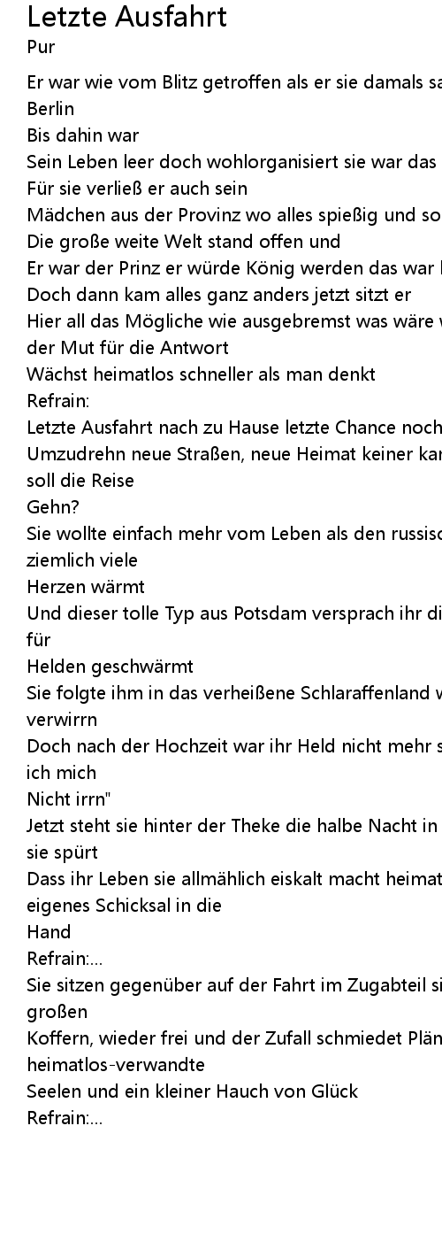 | Umzudrehn neue Stra en, neue Heimat keiner kann die Zukunft sehn sag mir, wohin soll die Reise | |