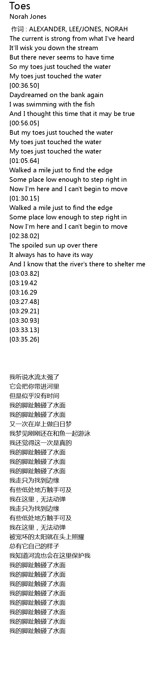 | [03:22.18][03:16.29][03:13.32][03:10.23][03:07.43] | My toes just touched the water |