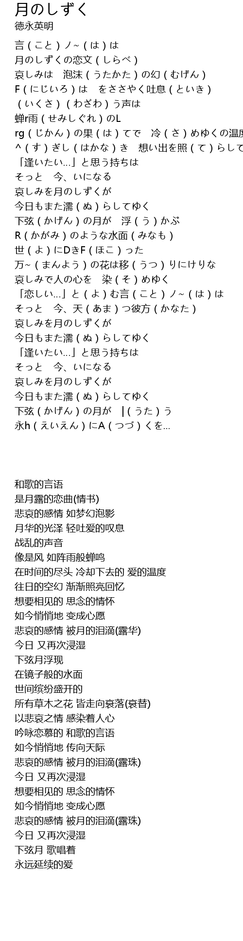 | [03:05.24] | 「恋しい…」と(よ)む言(こと)ノ~(は)は |
