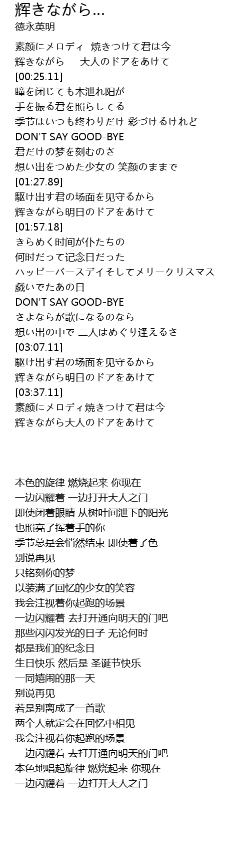 | [00:14.65] | 辉きながら 大人のドアをあけて |
