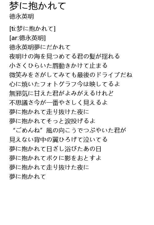 | [01:35.937] | 夢に抱かれてそっと涙投げるよ |