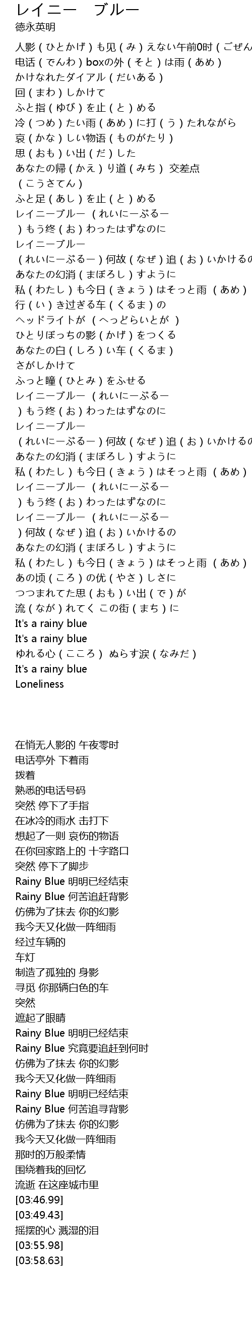 | [03:15.05] | レイニーブルー (れいにーぶるー )何故(なぜ)追(お)いかけるの |
