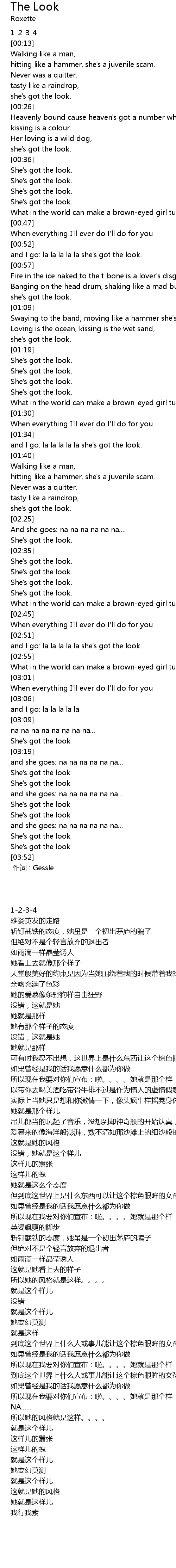 | [01:36] | and I go: la la la la la she' s got the look. |