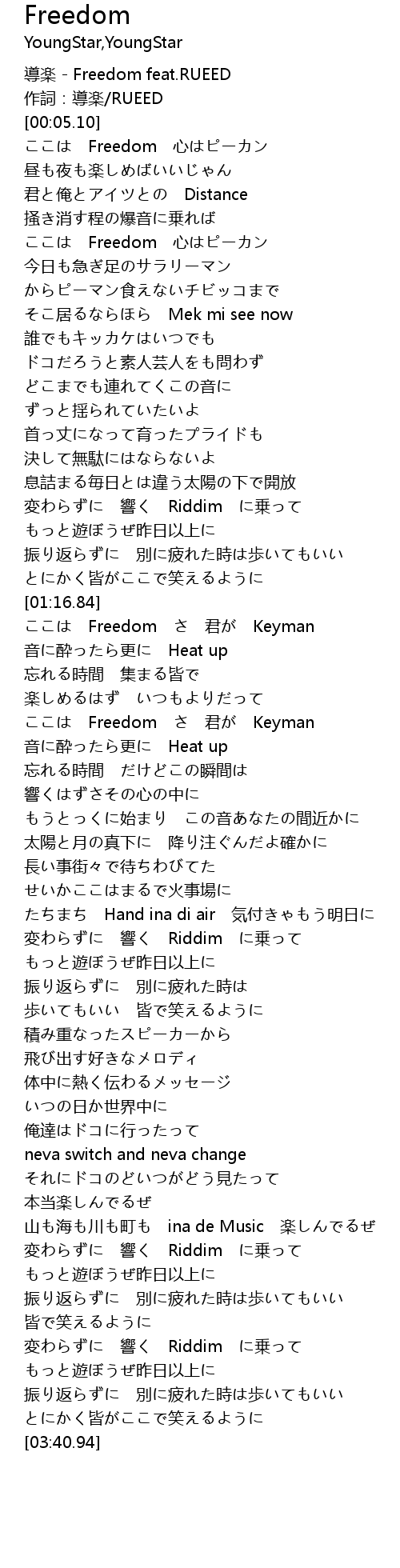 | [02:56.98] | 変わらずに 響く Riddim に乗って |