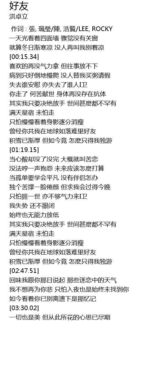 | [02:31.07] | céng jīng nǐ gòng wǒ zài dì qiú rú luò nàn lǐ hǎo yǒu |