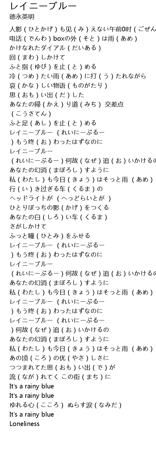 | [02:39.44] | レイニーブルー (れいにーぶるー )もう终(お)わったはずなのに |