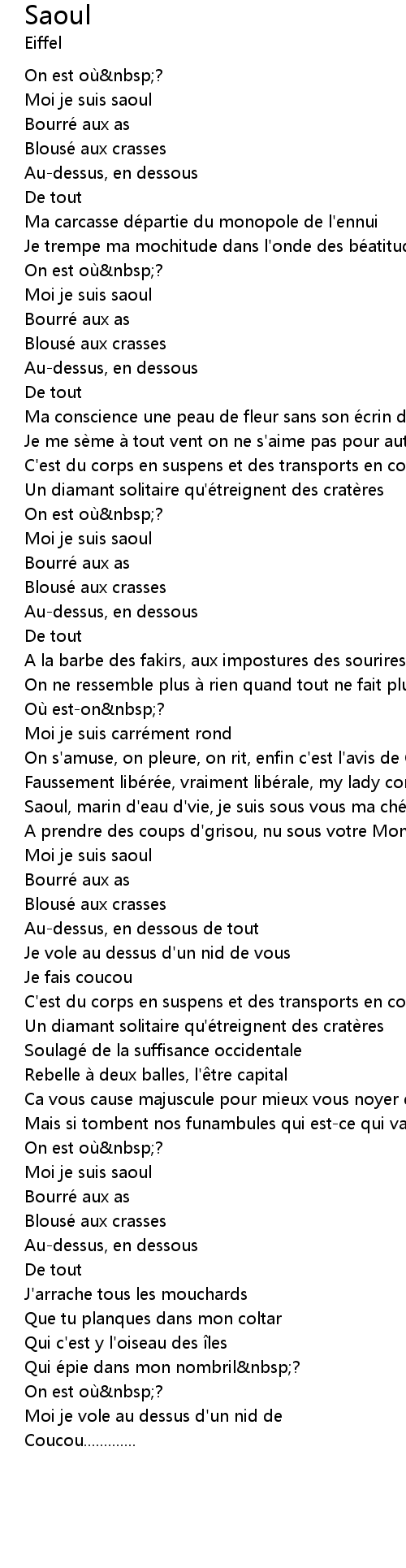 | Saoul, marin d' eau d' vie, je suis sous vous ma che rie | |