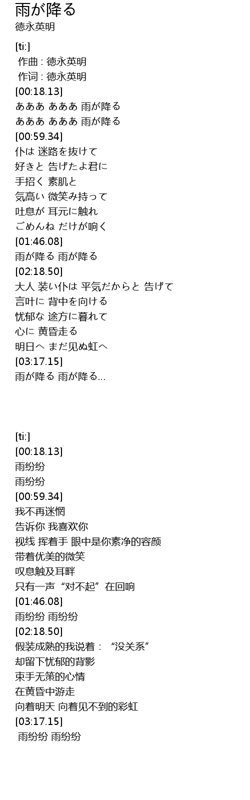 | [03:19.98] | 雨が降る 雨が降る… |