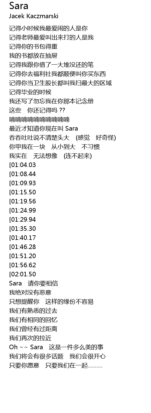 | [03:00.87][01:56.62] | Oh Sara ni rang wo xin jing jing |