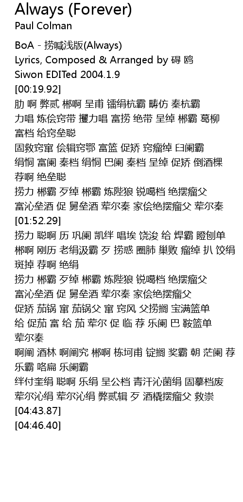 | [00:00.88] | BoA - 捞喊浅版(Always) |