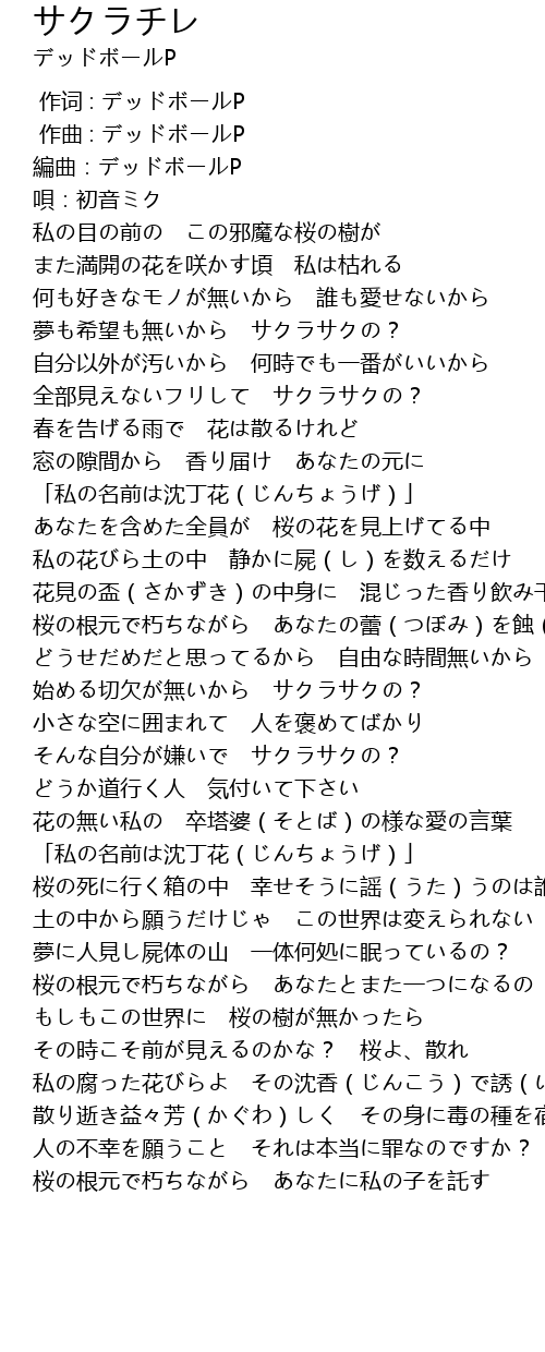| [01:36.928] | 桜の根元で朽ちながら あなたの蕾(つぼみ)を蝕(むしば)むの |