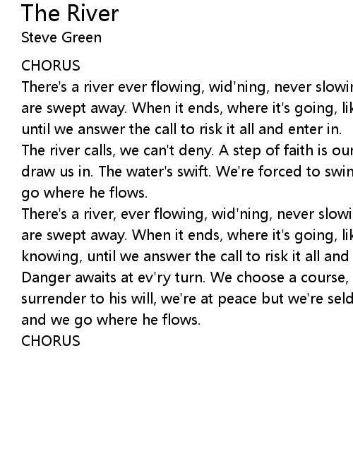 There's a river, ever flowing, wid'ning, never slowing, and all who made out in are swept away. When it ends, where it's going, like the wind, no way of knowing, until we answer the call to risk it all and enter in. |