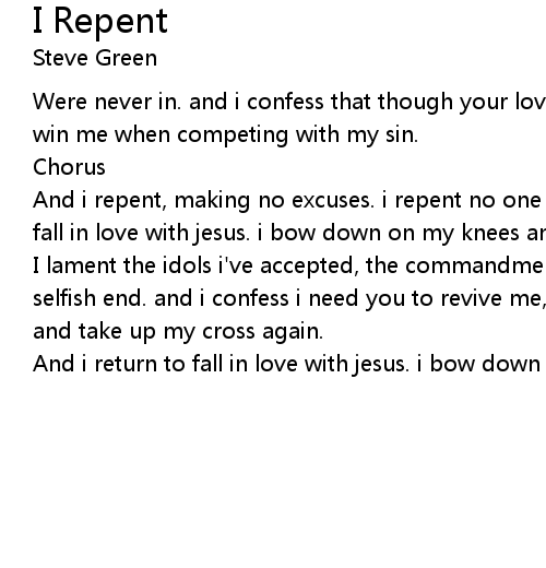 And i repent, making no excuses. i repent no one else to blame. and i return to fall in love with jesus. i bow down on my knees and i repent. |